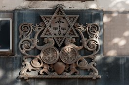 The design is a Magen David, or Star of David, supported by two lions of Judah rampant and wielding sabres. Beneath is a pair of medallions, decorated with Menorot or seven-branched candelabra. The clawed feet of the lions rest on a thin turned base which is fixed to the wall.